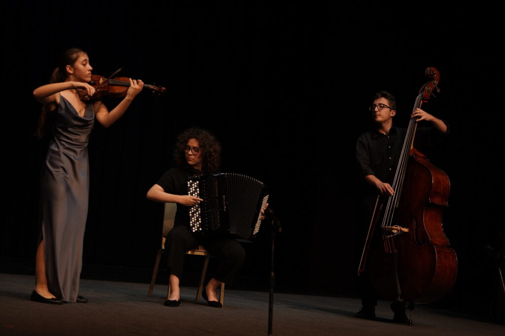 Trio 2/3, composto pelos alunos Maria Inês Ornelas, Sofia Chiara Nobile e Emanuel da Silva Inácio, vencedores da edição de 2023 na categoria de Música de Câmara/Combo de Jazz.