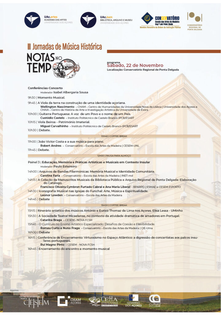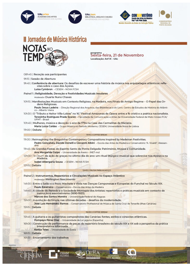 Após o sucesso da realização do evento no final do ano passado, na Madeira, é a vez da cidade de Ponta Delgada, nos Açores, acolher as Jornadas de Música Histórica ‘Notas no Tempo’, nos dias 21 e 22 de novembro de 2025. Este evento, que celebra o património musical dos Açores, da Madeira e do Atlântico, terá lugar no Anfiteatro VIII da Universidade dos Açores (21 de novembro) e no Conservatório Regional de Ponta Delgada (22 de novembro), reunindo especialistas, músicos e entusiastas do estudo da música histórica. O programa já é conhecido (em baixo) e todas as informações relativas a esse procedimento poderão ser consultadas sítio oficial da Biblioteca, Arquivo e Museu da Universidade dos Açores, em https://bam.uac.pt/.