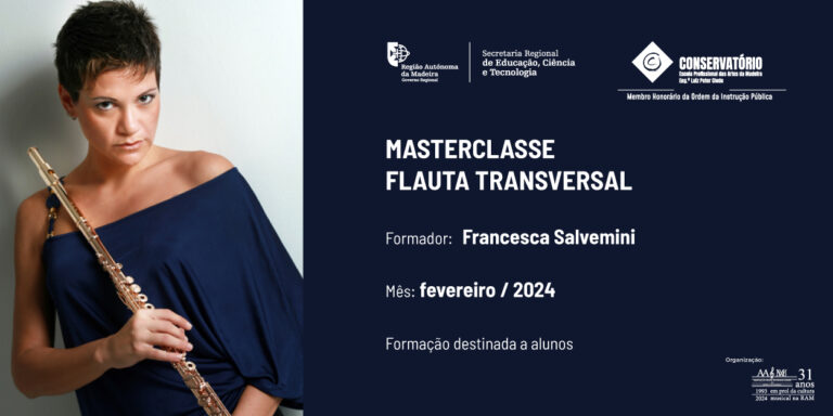 Também fruto desta parceria, será realizada uma masterclass de flauta transversal com Francesca Salvemini, no dia 9, entre as 14h00 e as 17h00. Esta artista italiana é detentora de vários prémios em concursos nacionais e internacional e que se apresenta, regularmente, como solista, em salas prestigiosas da Itália e do resto da Europa (Berlim, Milão, Veneza, Genebra, Mexico City, Istanbul, Nova Iorque, Madrid, Amesterdão, Helsínquia).