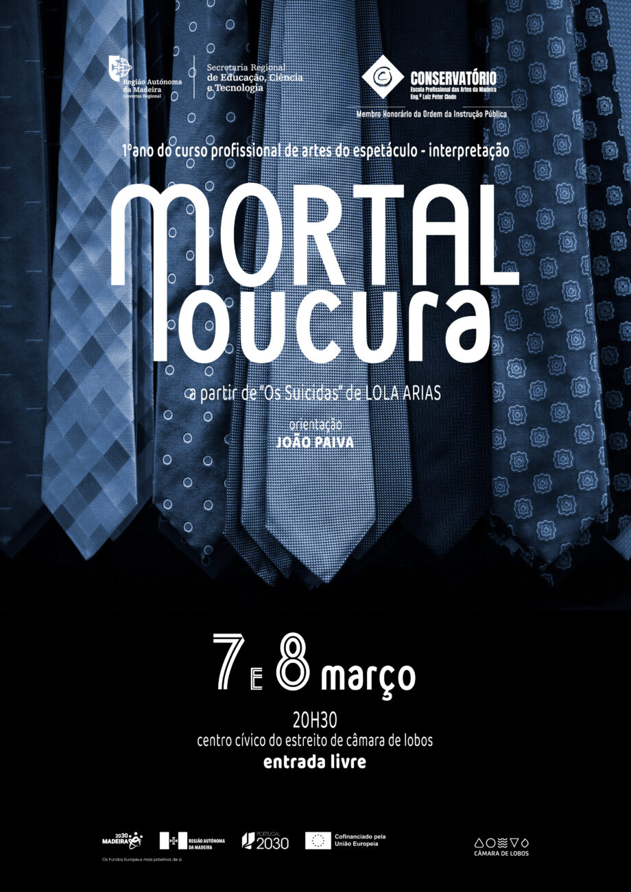 Nos próximos dias 7 e 8 de março, sobe ao palco o espetáculo ‘Mortal Loucura’, a partir de ‘Os Suicidas’, de Lola Arias, protagonizado pelos alunos do 1.º ano do Curso Profissional de Artes do Espetáculo – Interpretação do Conservatório, com orientação do professor João Paiva. Este espetáculo, que decorrerá no Centro Cívico do Estreito de Câmara de Lobos, terá a sua estreia pelas 20h30 do dia 7, quinta-feira, com repetição no dia seguinte pela mesma hora. A entrada é gratuita.