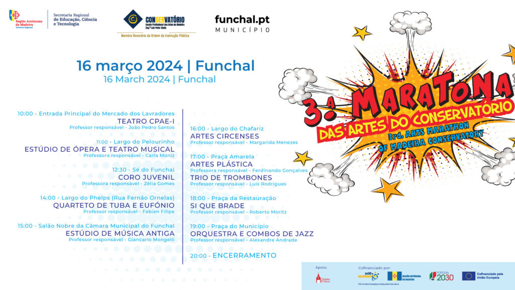 No próximo sábado, dia 16 de março, entre as 10h00 e as 20h00, a cidade do Funchal vai acolher vários concertos protagonizados por alunos do Conservatório – Escola Profissional das Artes da Madeira, Eng.º Luiz Peter Clode, inseridos na 3.ª Maratona das Artes desta instituição educativa, num projeto em coprodução com a Câmara Municipal do Funchal.